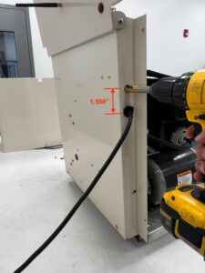 - On the left face of the back metal wall, using a 9/16″ metal drill bit, drill a hole 1.5″ directly above the power cable fitting. Use a tape measure and sharpie as necessary to mark the drill point.